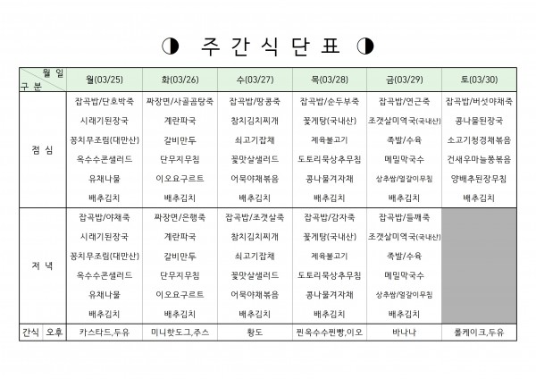 3월 넷째주 식단표입니다. 페이지 정보 작성자 박천광 작성일24-04-04 16:02 조회1,130회 댓글0건 관련링크 본문 3월 넷째주 식단표입니다. 댓글목록 등록된 댓글이 없습니다. 이전글 다음글 목록